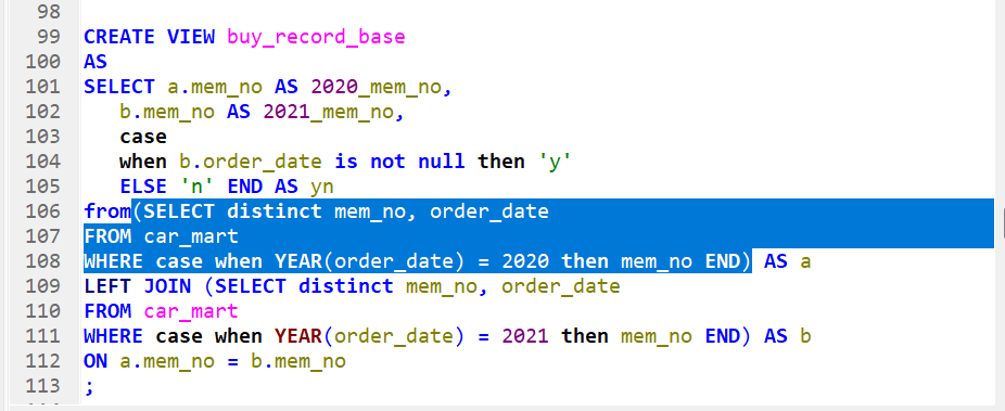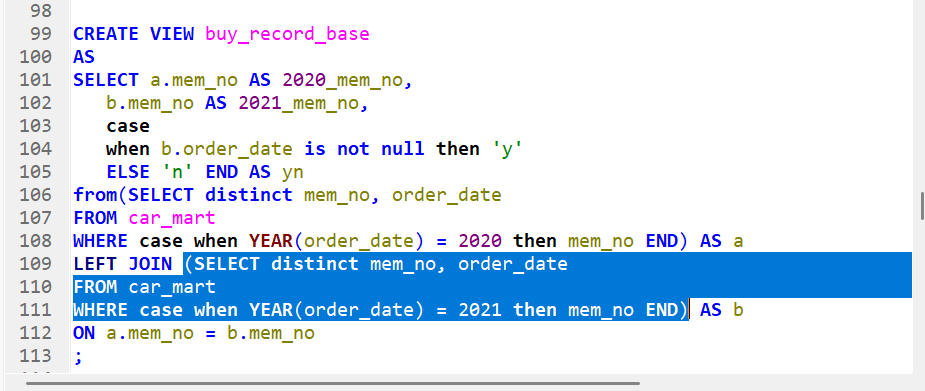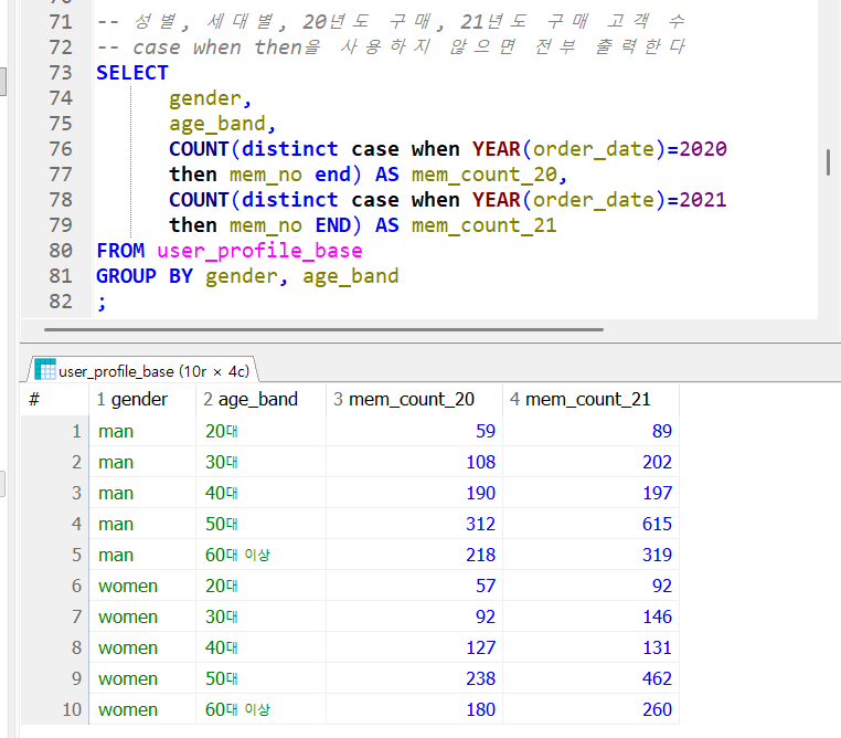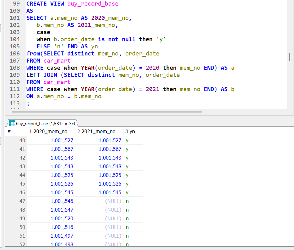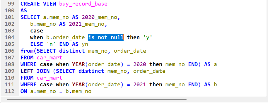 평소 사용하는 case when then else end 조건구문이지만 해석하자면 언제? b.order_date(2021년 구매 데이터)가(is) 아닐 때(not) 0이(null) 2021년의 구매데이터가 0이 아닐때, 다시 말해 구매데이터가 존재할때, 파생컬럼 yn의 값은 'y'가 되는것이다. 그리고 else로 나머지 다 걸러서 'n' 추출.