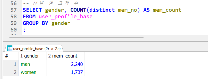 같은 쿼리에서 세대값만 성별로 바꿨다. 남성이 여성보다 1.5배가 더 많다. 여기서 세대 별, 성별로 나누려면
