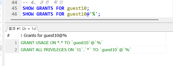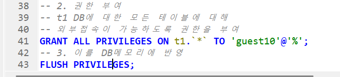 1. 호스트를 %로 두어 접근이 가능한 계저을 생성한다.2. GRANT ALL PRIVILEGES ON 데이터베이스명.*(전부라는뜻) TO 계정3. guest10에 대한 권한을 보여줘라~ 라는뜻이다. 권한이 부여된것을 확인cmd에서 확인한 데이터베이스명이다. guest10 계정에 대해 t1 데이터베이스에도 접근이 가능한 것을 확인할 수 있다.