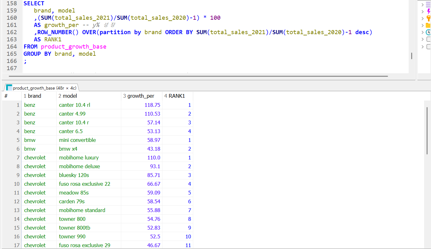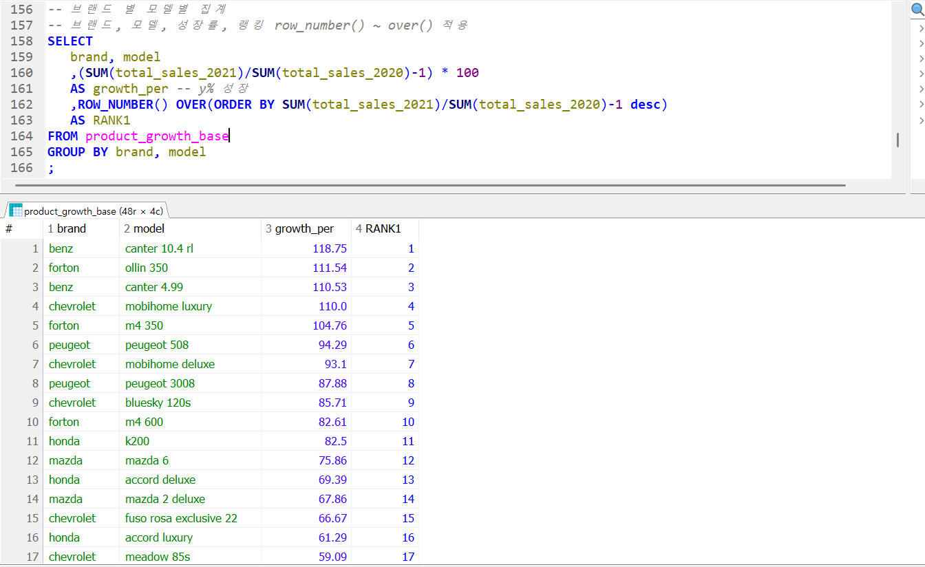 이런 식으로 기존의 수업내용을 응용해서 각 모델별 성장세 또한 순위를 매길 수 있다. row_number() over () 구문을 이용해서 랭크를 매기고 over(order by 성장률 desc(내림차순)) 으로 많이 오른 순위를 매겼다.