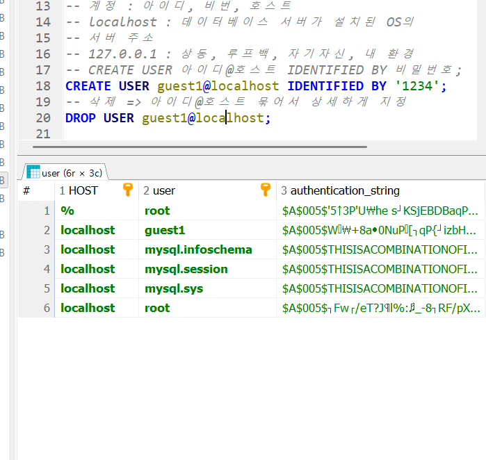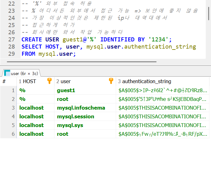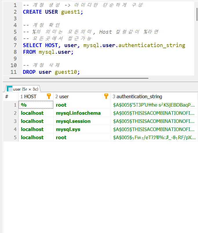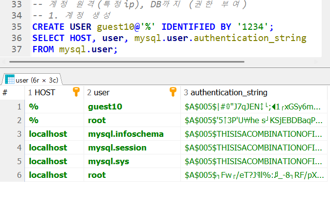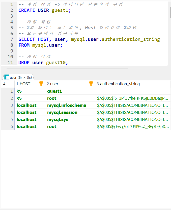 초기 계정값이다.여기서 2번 쿼리를 실행시키면결과셋에 guest1이 추가된 것을 볼 수 있다.