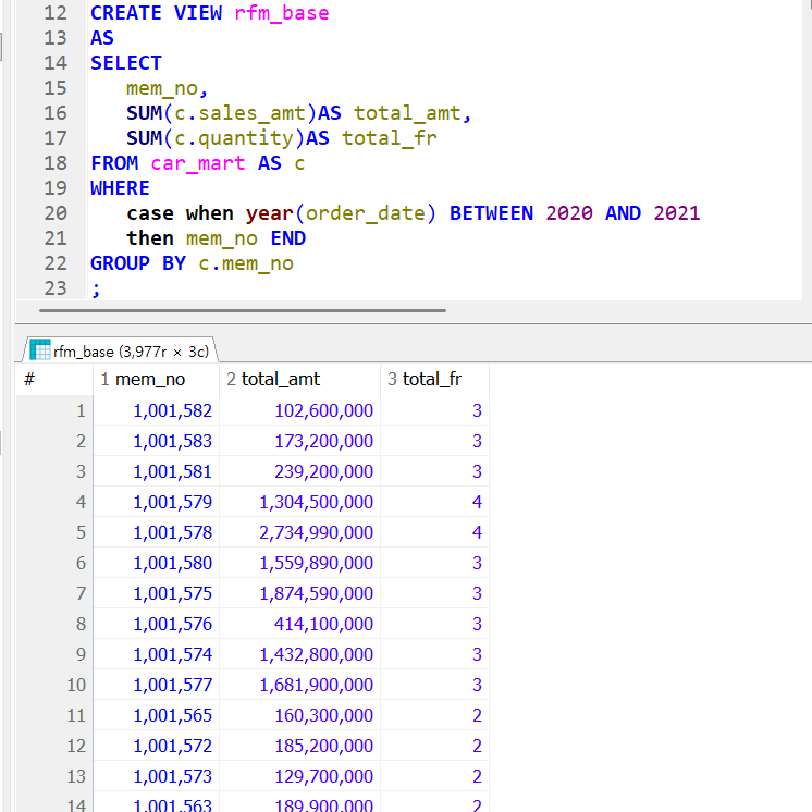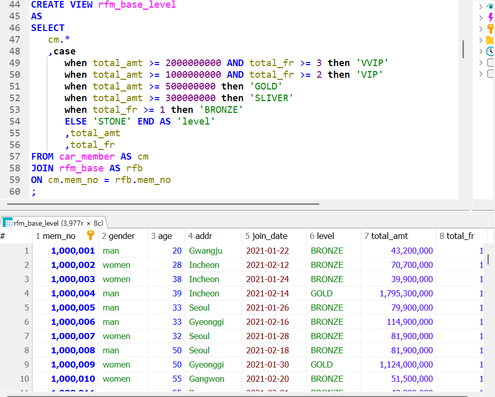 먼저 car_member와 rfm_base를 join한다는 생각을 한다. 그 이후 car_member의 별칭 cm의 모든 컬럼을 추가하고 rfm_base에서 level컬럼을 추가해준다. 이 때, case when then else end 조건구문을 사용하며 각 데이터들은 가장 상위 조건부터 통과하며 True라면 걸리고 False라면 아래로 내려온다. 그 이후 다른 컬럼을 추가하고 create view를 해주면 완성