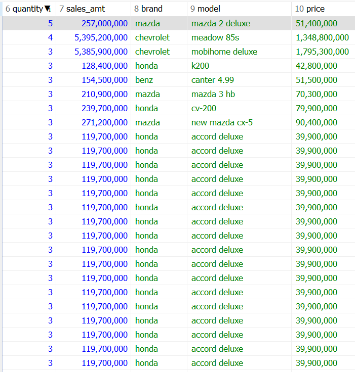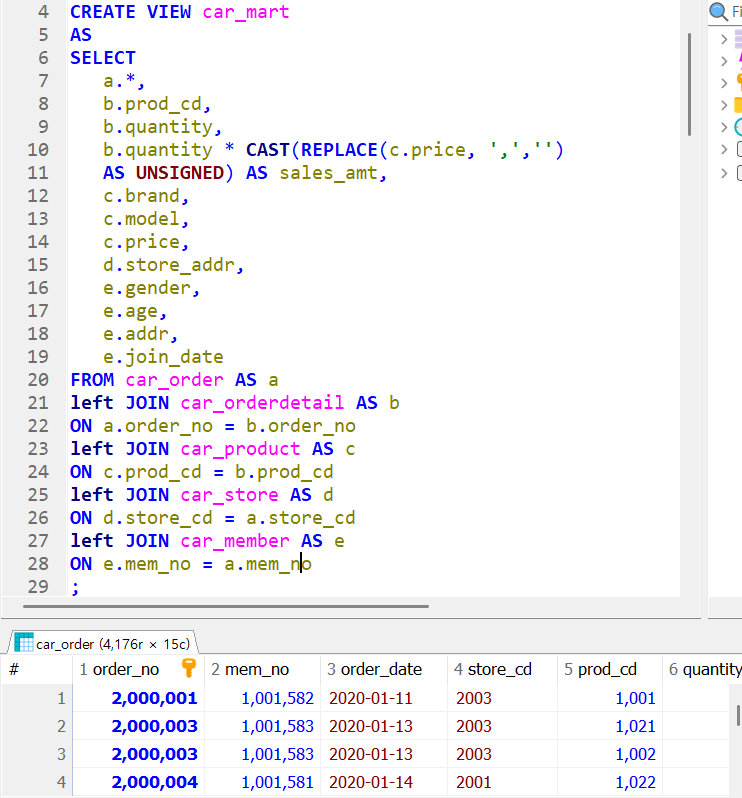수많은 테이블들에서 필요한 컬럼만 추출하여 새로운 가상의 테이블인 car_mart를 생성해낸다. 이 때 price는 문자열이기 때문에 replace함수를 사용해서 , 을 없애주고 cast 함수를 사용해서 수치값으로 변형시킨후 주문수량과 곱하여 한 고객이 구매한 총 금액을 출력한다. 그 이후 car_order를 기준으로 left join을 통해서 각 테이블들을 조인시켜준다. 사실 조인이 먼저고 그 이후에 결과셋 구성이긴 하다, 문자열인 금액에 주문 횟수를 곱하여 총 주문금액인 sales_amt가 새 컬럼으로 들어왔다 더 보기 쉽게 view를 만들 때에 순서를 조정해도 좋다..