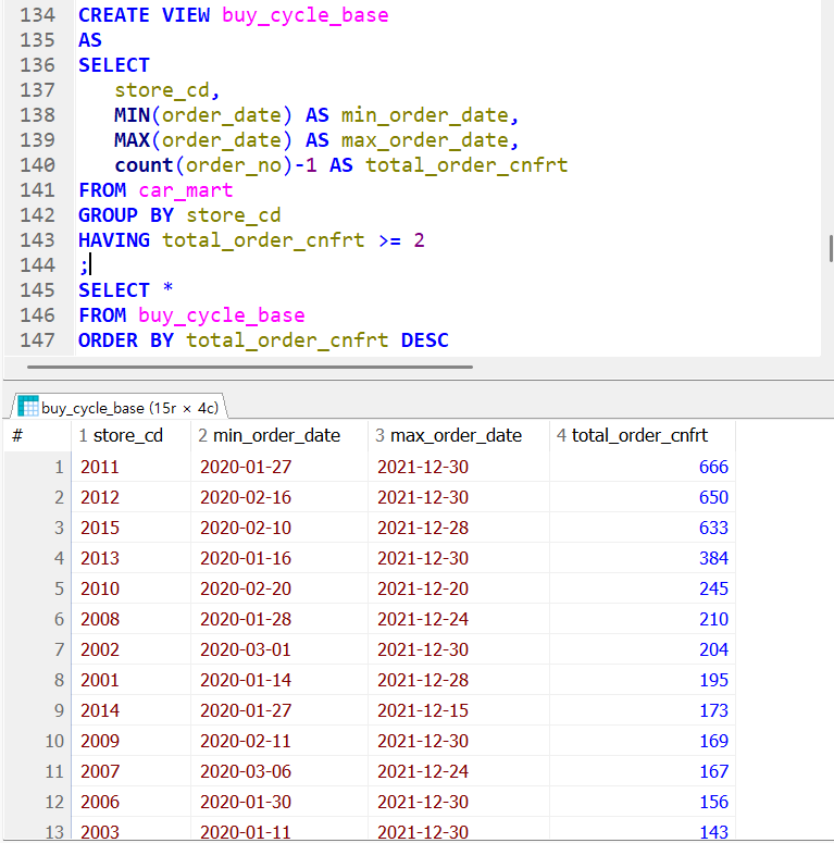 먼저 구매주기를 계산하기 전에 새 뷰로 정리부터 해본다. 가게 코드인 store_cd로 그룹화하여 가게별 최소 주문날짜(시간 객체는 크기를 비교할 수 있다.)와 최대 주문날짜(가장 최근 주문 날짜), 그리고 각 주문간의 간격을 계산한다. 여기서 count(주문번호)에서 - 1 을 하는 이유는 주문 주기이기 때문이다. 만약 4개를 4일동안 구매하였으면 각 물건을 구매한 그 날짜 사이의 간격은 3개이기 때문에 주문 4개 - 1 개로 3개의 간격을 나눠야하기 때문이다. 헷갈린다 그리고 group by를 진행하였으니 having으로 최소 주문 개수가 2개 이상인 가게로 한정짓는다.