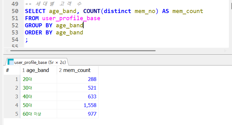 결과셋에 age_band와 고객번호를 카운트한다, 이 때 distinct를 사용해서 중복을 제거해준다.