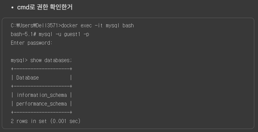 cmd에서 권한 확인, 기본 DB외에는 조회되지 않는다.