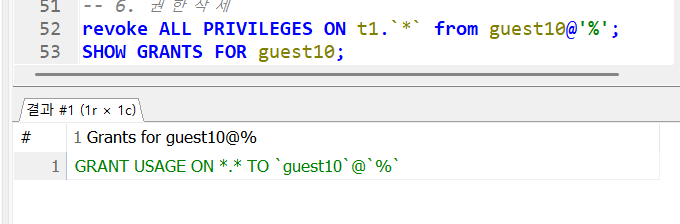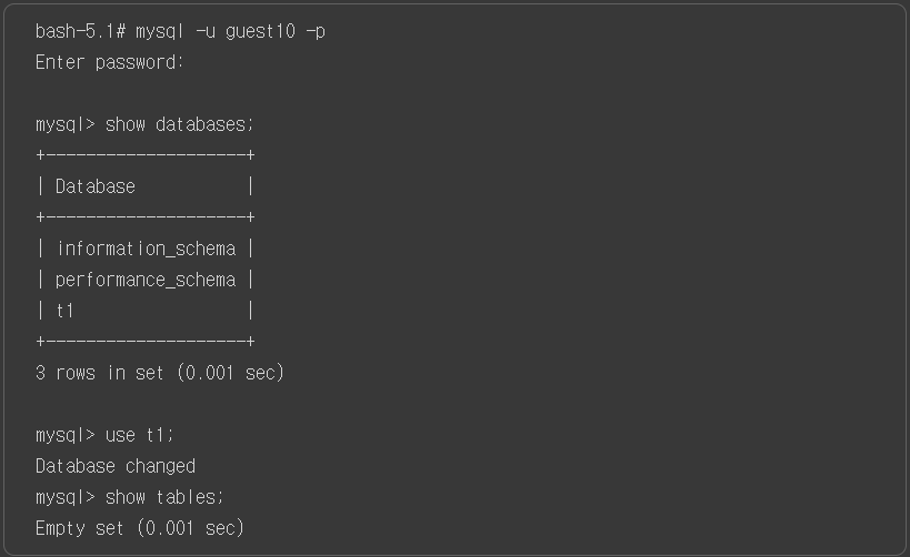 4. revoke 함수로 guest10 계정에 권한을 삭제했다, 이제 t1 DB에 접속이 안된다.