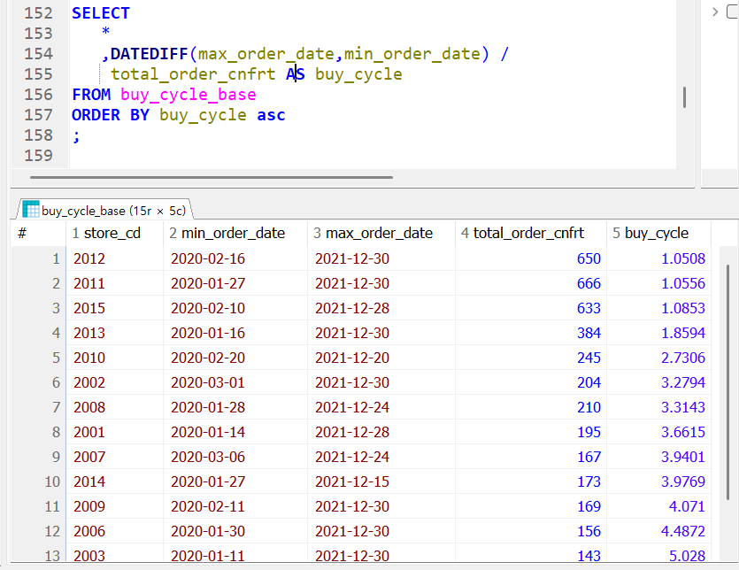 buy_cycle의 모든 컬럼과 더해서 datediff 함수를 사용했다. 이는 날짜와 날짜 사이의 시간을 찾아주는 함수로 datediff( 미래 날짜 , 과거 날짜 ) 는 그 사이의 일수를 찾아준다. buy_cycle = 구매 날짜 주기 / 총 주문 개수 로 1에 가까울 수록 하루에 한개씩 팔았다는 뜻이 된다. 마지막에 순서대로 정리해주며 2012번 매장과 2011번 매장이 잘 된다는 사실을 알 수 있다.