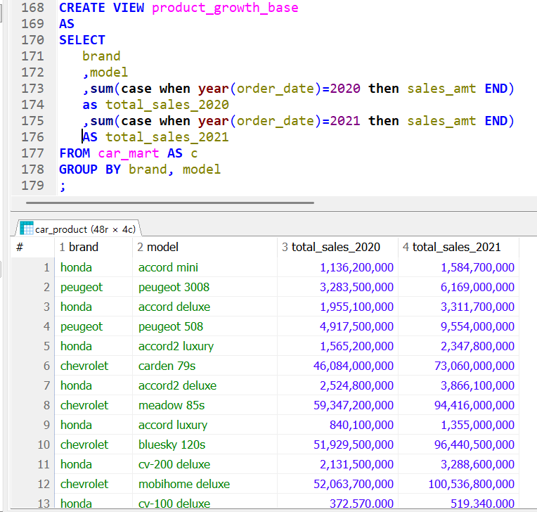 1. 브랜드와 모델을 집계대상으로 삼아 group by를 진행한다. 2. order_date가 2020인, 그리고 2021인 곳의 sales_amt를 집계한다 sum()을 이용해서 3. 브랜드, 모델로 그룹이 나눠지고 그 브랜드의 모델의 2020,2021년도 판매금액이 집계된다.