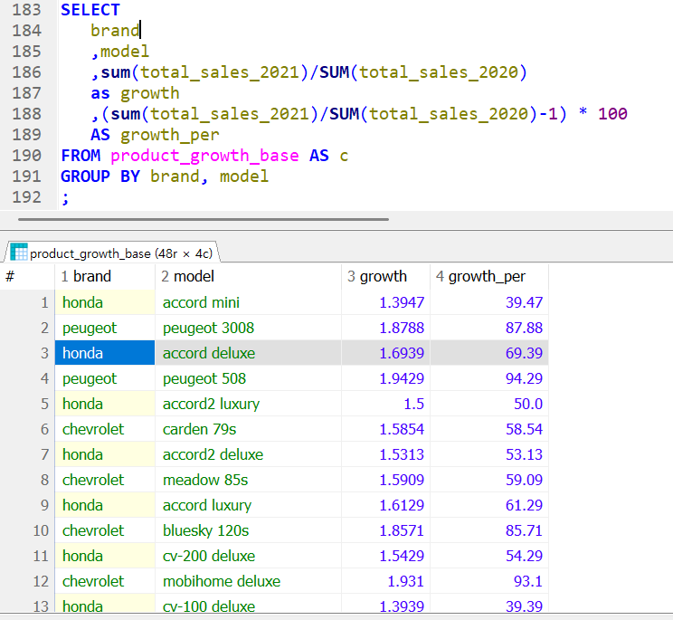 2021년도 판매액 / 2020 판매액 = 그 브랜드모델의 판매대금 성장률이다. 여기서 (sum(...) -1) * 100을 해주면 퍼센트로 볼 수 있다.