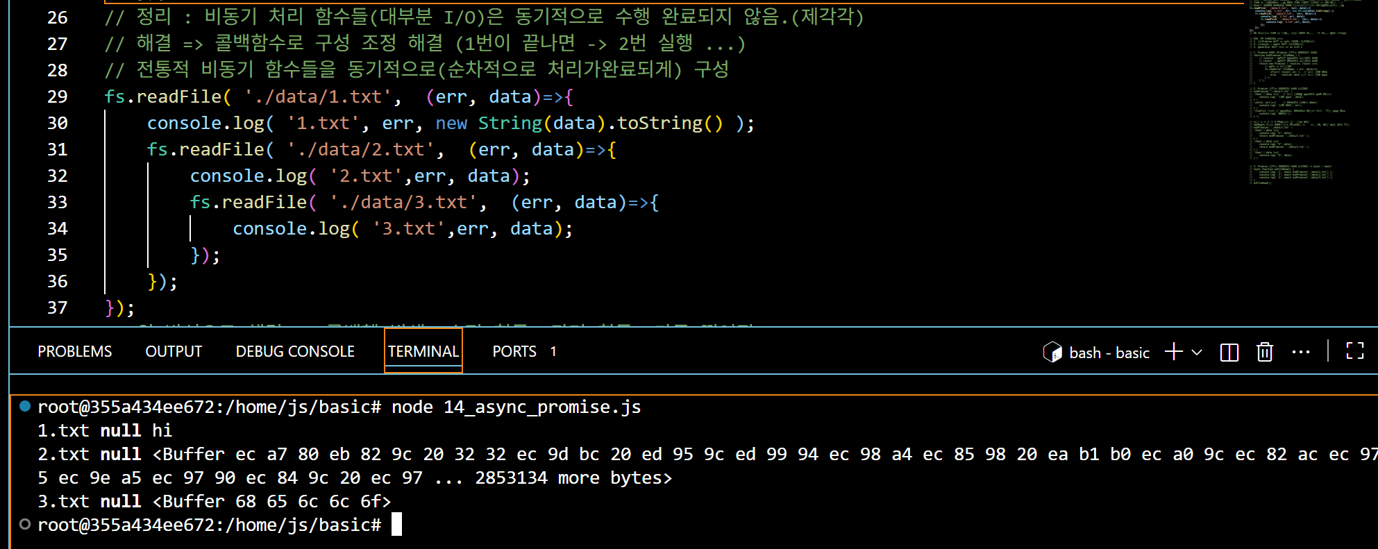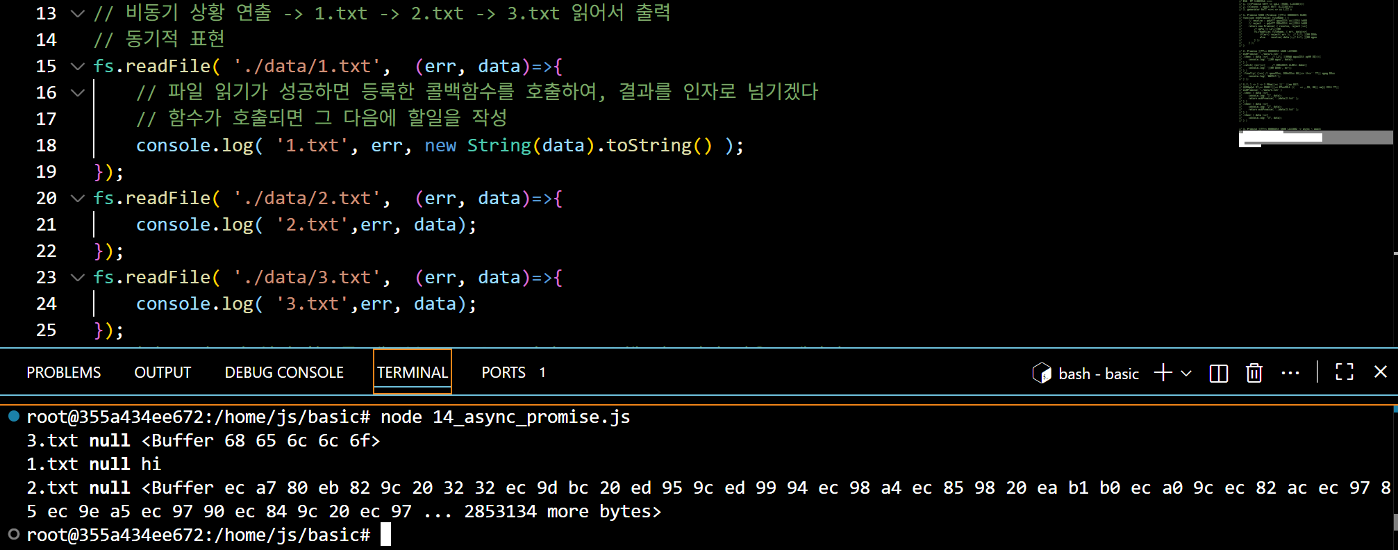 2. 비동기 상황 연출 현재 txt 파일 1, 2, 3이 있다. 1 은 hi 3은 hello 2는 뉴스 기사글 엄청 많이 긁어와서 25000행정도 되는 txt파일이다. 비동기상황은 간단하게 병렬구조로 파이썬처럼 순서 1, 2, 3이 아니라 먼저 진행되는 코드순으로 출력이 되는것이다.