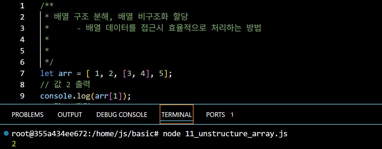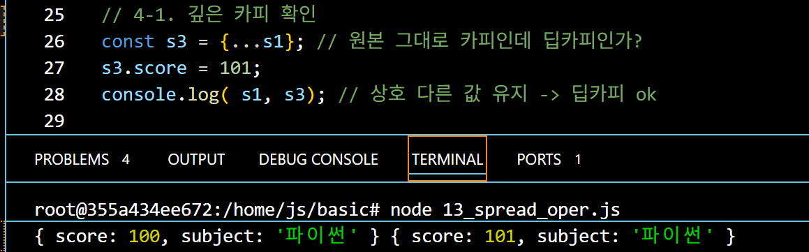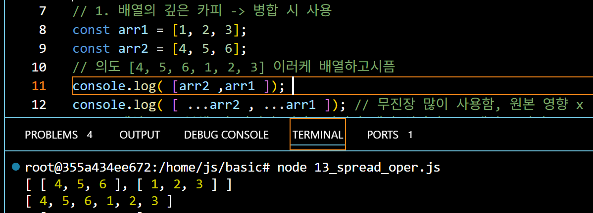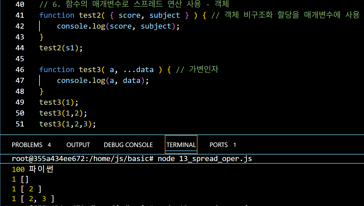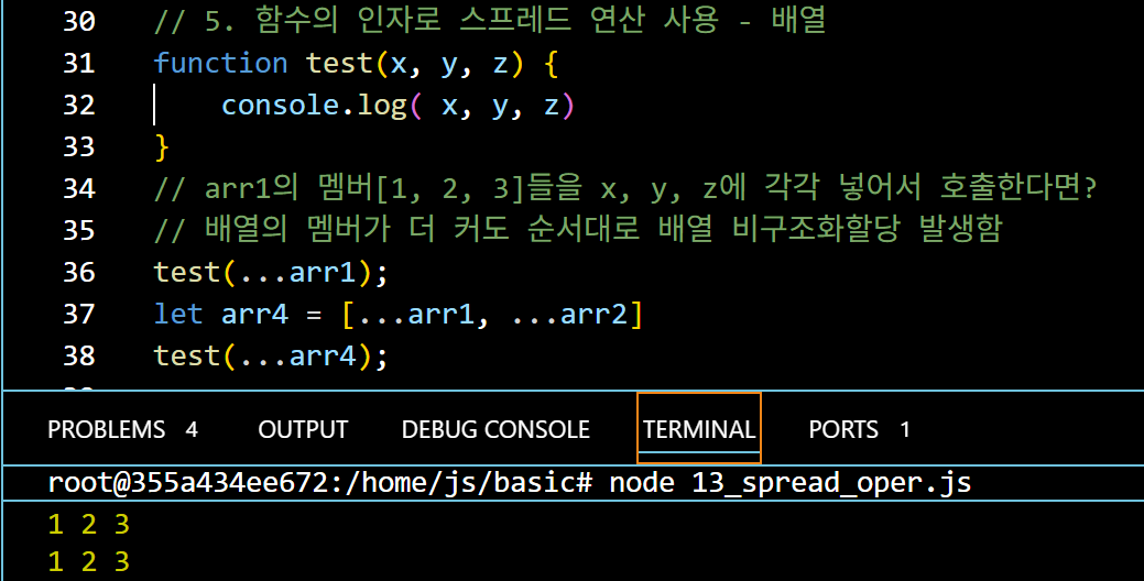객체를 병합하여 arr4는 현재 [1, 2, 3, 4, 5, 6] 이다. 이 때 3개의 인자를 가진 test 함수에 순서대로 값이 들어가기 때문에 (할당) 출력은 둘 다 1 2 3 이 되는것이다.