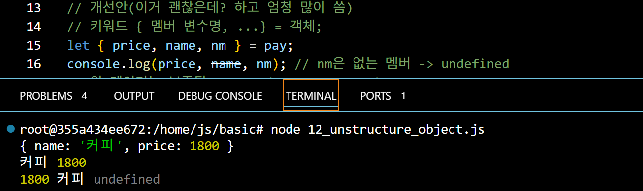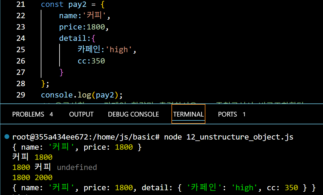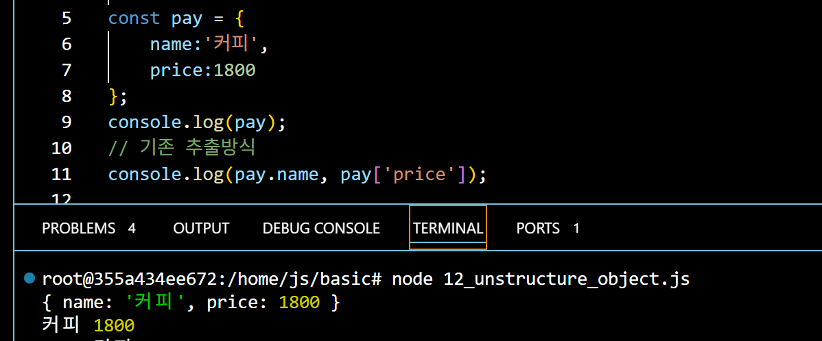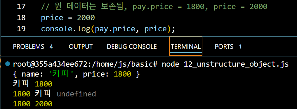 pay에 있는 값들을 왼쪽의 객체에 할당하여 출력하는 방법이다, 더욱 간소화되고 편하게 데이터를 얻어낼 수 있다. 만약 그냥 console.log(price)를 입력하면 오류가 나온다 1800 2000