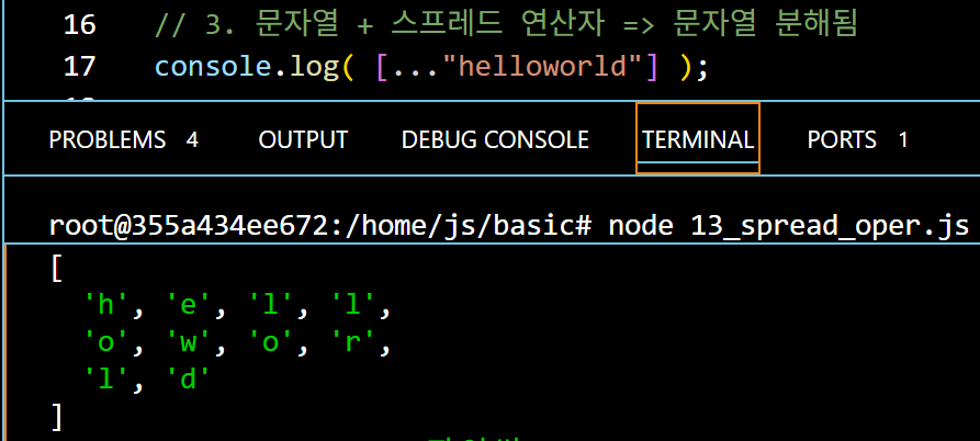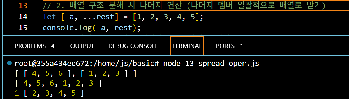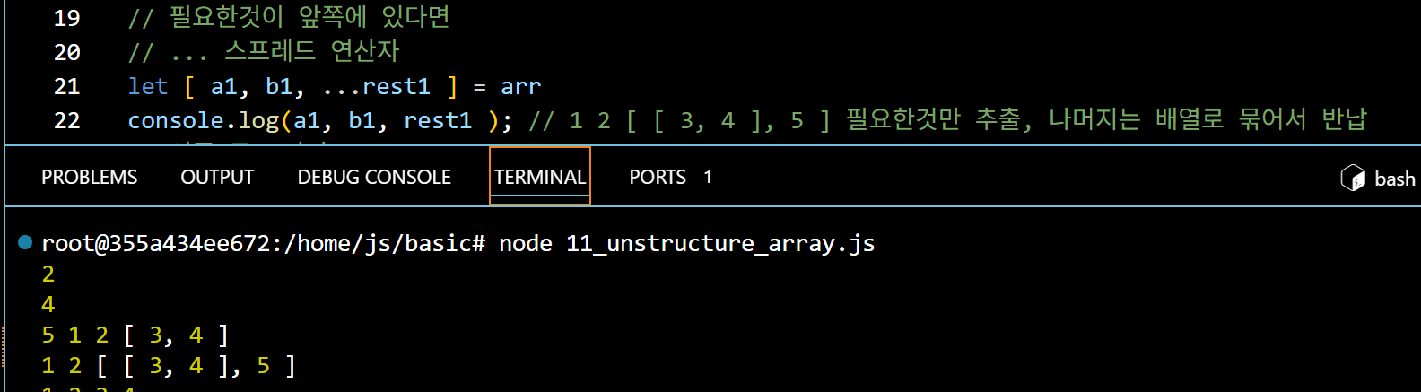이 때 사용하는 것이 스프레드 연산자이다. 스프레드 연산자 = ... a1= 1 b1 = 2가 출력되고 나머지 [3,4], 5 는 rest1이라는 하나의 배열에 함께 담겨서 반납된다,. 1 2 3 4