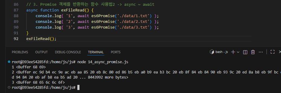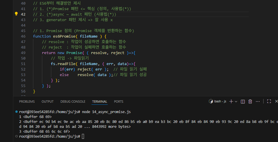 promise 정의 함수를 선언하고 작업의 성공, 실패 여부에 따라 출력하는 함수다. 정의한 es6Promise 함수를 사용하면 예외처리 기능을 사용해서 읽기가 성공하면 실행되도록 코드를 만들 수 있다, 일종의 조건문?