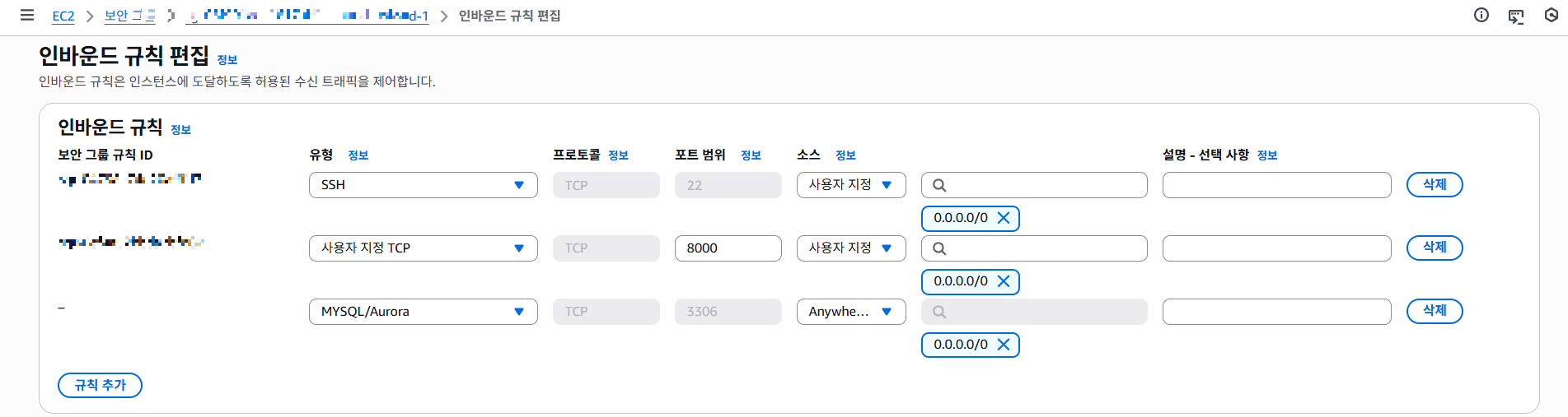 - EC2 > 네트워크 및 보안 > 보안그룹 > 위에서 설정한 보안그룹 선택 > 인바운드 편집 > 3306번 포트 추가(MySQL / Aurora) > 저장