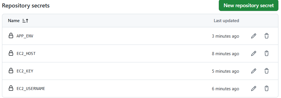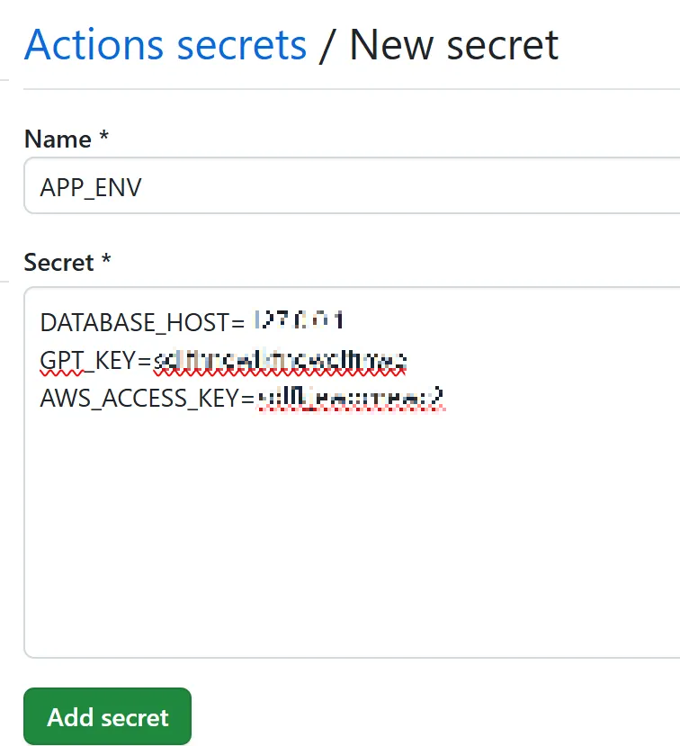 - 레포지토리 > setting > secr... > actions > new Repository secrets 버튼 클릭 > 제목, 내용 입력 > 저장