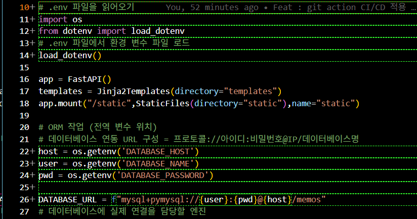 그런데 main.py에 내 비밀번호, 엔드포인트 등 공개되면 안될 정보들이 있다. 그래서 이를 해결하기 위해서 .env 파일을 사용한다.