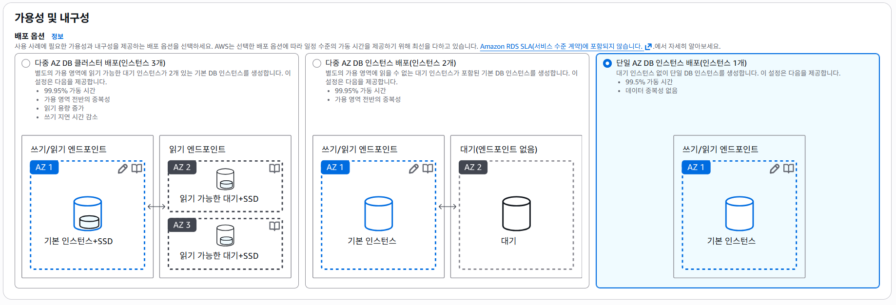 가용성 및 내구성 : 단일 AZ DB 인스턴스 배포