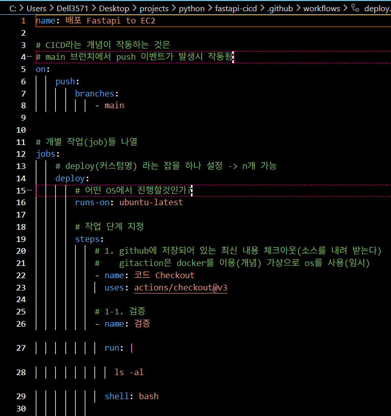 12~26 코드 : 개별 작업 하겠다 - deploy라는 작업 - ubuntu에서 하겠다 - 이 단계로 - 코드 checkout이라는 이름의 작업을