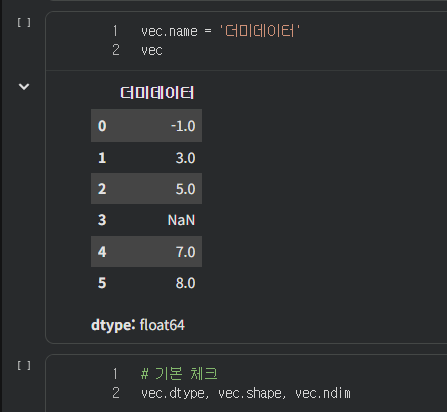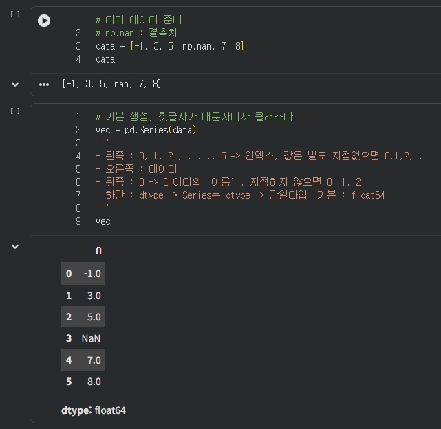 - 구성 = ndarray(1차원) + 인덱스(0, 1, 2, . . . 특정값(날짜, 시간 등))