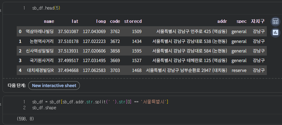 그래서 코드를 이용하여서 addr.str 값에 서울특별시가 있는 데이터만 골라서 다시 이름을 부여했다.