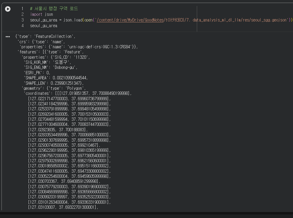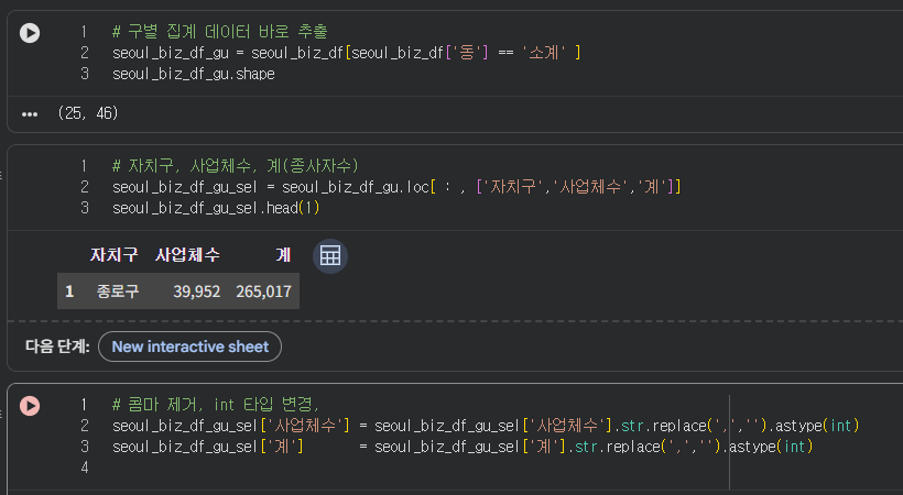 이 데이터상에는 자치구 컬럼이 없었어서 서울특별시 값을 추출해온 코드에서 인덱스만 1번으로 바꿔주고