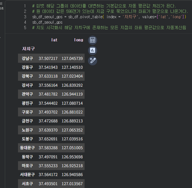 피벗테이블은 값을 묶어주면 자동으로 그 좌표들을 평균값으로 묶어서 저장해준다. 그리고 지도에서 저 좌표를 찍으면