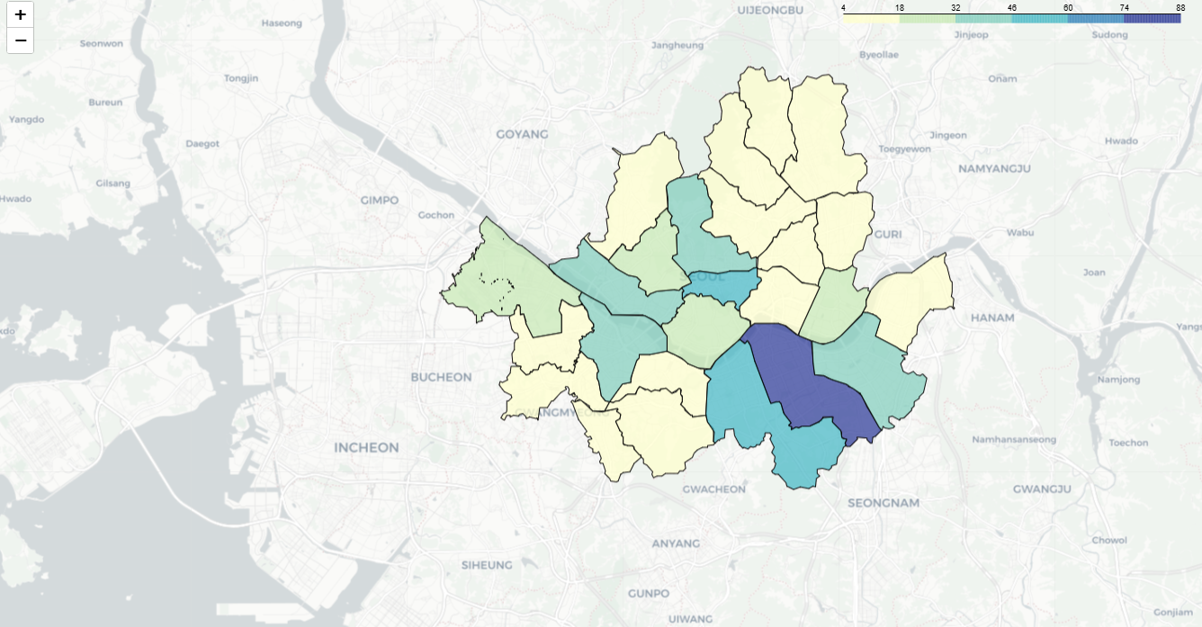 서울의 자치구별 매장 수에 따라 색이 변해서 출력되는 모습이다.