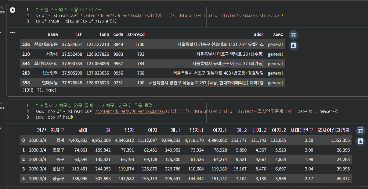 먼저 csv파일을 불러와서 체크한 후, 자치구 별 인구 통계 데이터도 불러온다.