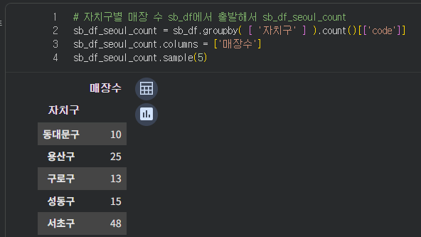 자치구와 매장수만 있는 데이터 만들어준다, groupby도 되고 pivot_table도 된다,