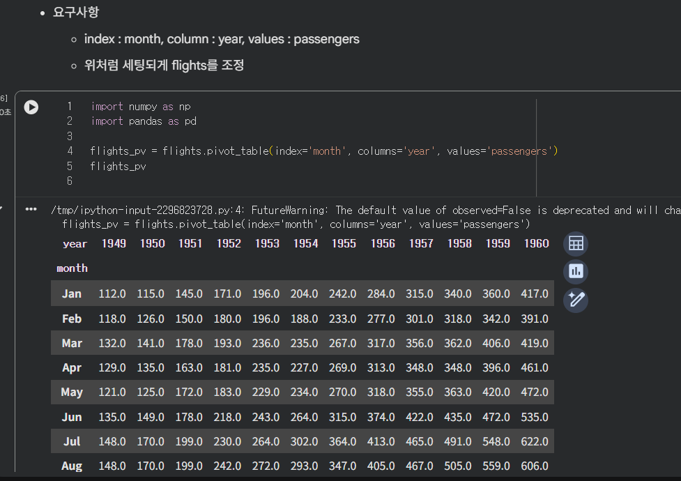 피벗 테이블을 이용해서 인덱스와 컬럼값을 세팅하였다.