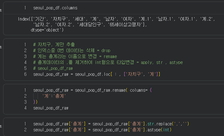 컬럼을 체크한 후 자치구, 계만 추출하고 이름 바꾸고 데이터 삭제하고 타입 변경하고 많이많이 한다.