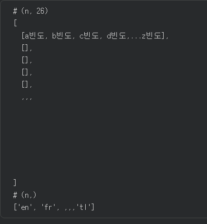 - 말뭉치 -> 노이즈 제거(알파벳 제외한 모든 문자), 정규식 활용 -> 소문자 변환 -> 빈도 계산 -> 0 ~ 1 사이로 빈도를 정규화처리 (피쳐 스케일링) -> ( n , 26 + 1) : ndarray or DataFrame or 2차원 리스트, (n , 1)