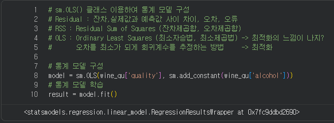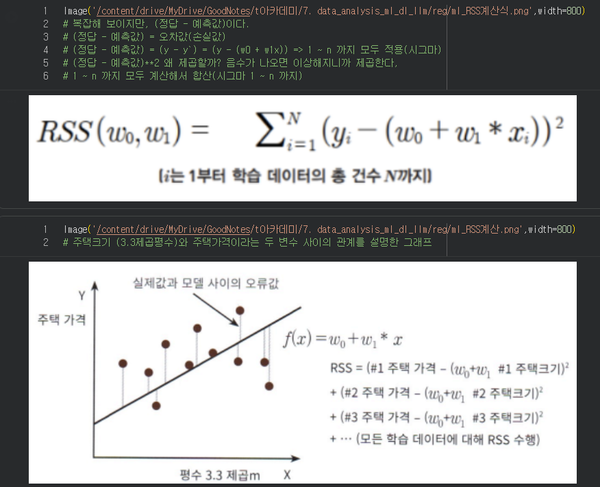 - rss값이 최소가 되도록 회귀계수 w0, w1을 조정하는것이 => 학습