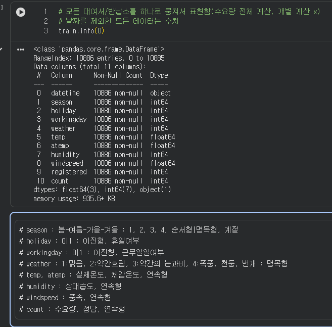 - 날씨, 계절, 근무일, 휴무일, 날짜, 온도, 체감온도, 풍속