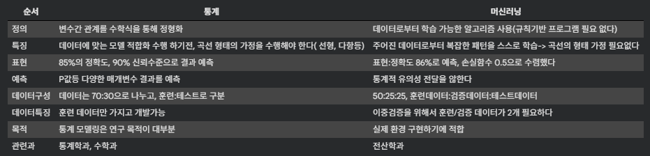 - 독립변수와 종속변수간의 관계(식)을 모델링 하는 방법