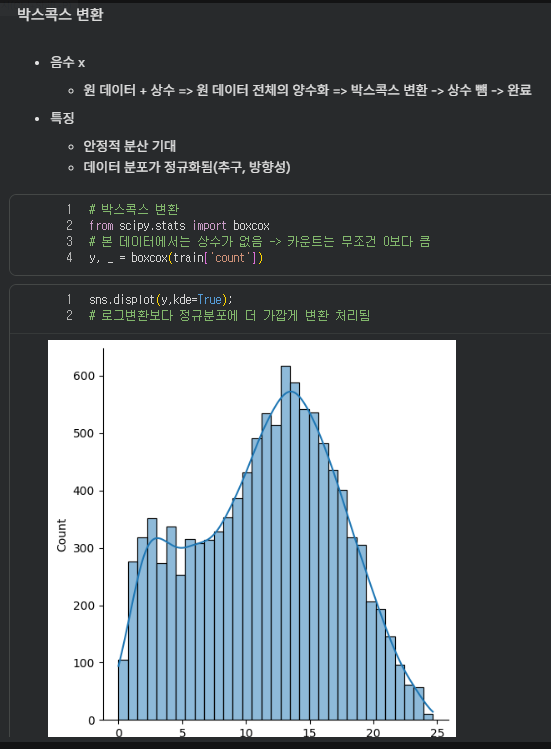 박스콕스변환, 안정적 분산을 기대할 수 있다, 원래는 상수를 추가하기도 하지만 이번 컬럼 count는 음수일 수 없기 떄문에 상수를 더하지 않아준다.