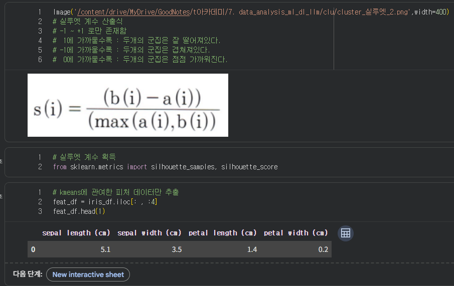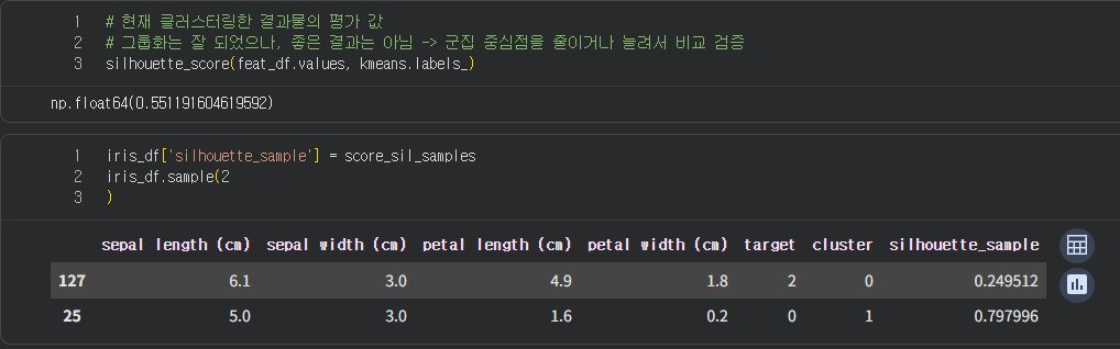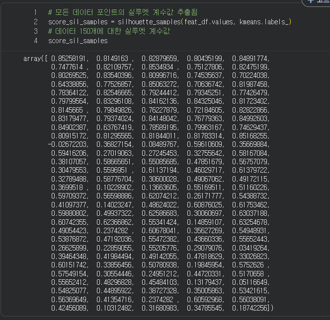 사이킷런에 실루엣 계수 획득 함수도 있다, 산출식은 저렇게 되어있 고 현재 KMEAN에 관련된 피처 데이터만 따로 담아준다.