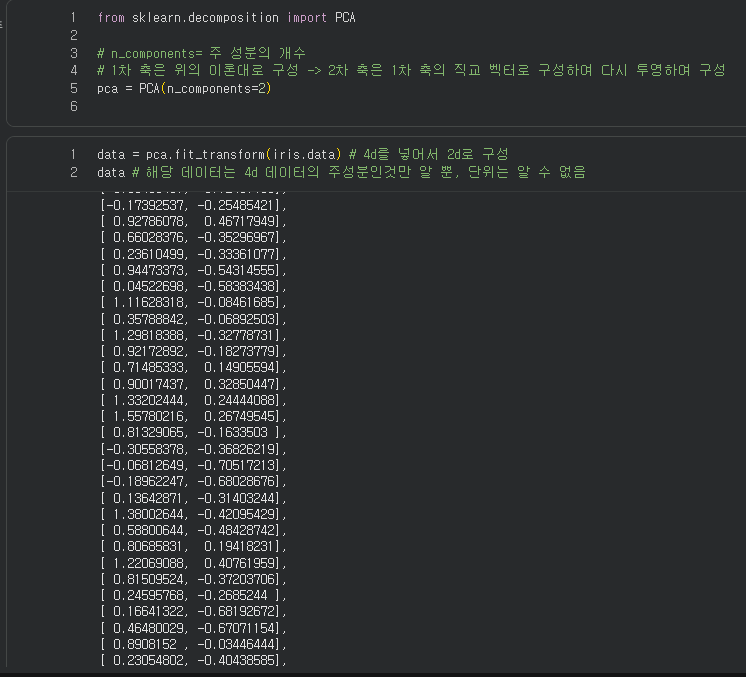 # 2. 해당 축으로 데이터를 투영 -> 새로운 좌표값 생성(데이터)