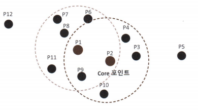 - 중심점 위치되면 그 거리를 기반으로 데이터 포인트들을 같은 그룹으로 선택
