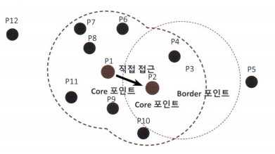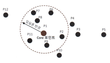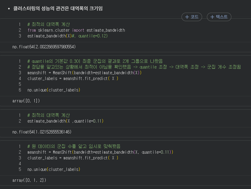 - 특정 대역폭(bandwidth, 원형 반경)내에 데이터포인트를 체크 -> 밀도 체크 군집 수행