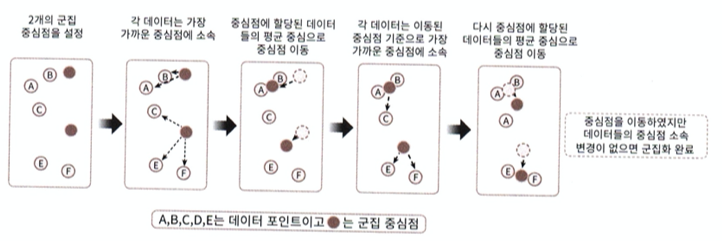 - 군집중심점의 데이터포인트 간에 그룹별 센터에 위치하게 됨 공정을 계속 반복 => 언제까지(최적화포인트)