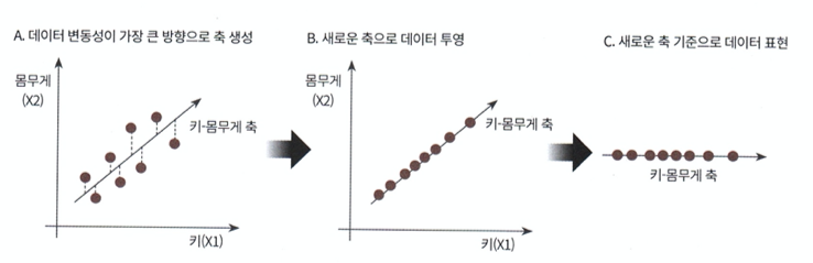 # 결론 : 아래 그림 기준으로 2개 좌표값에 의해 새로운 축에 투영된 1개의 데이터로 표현
