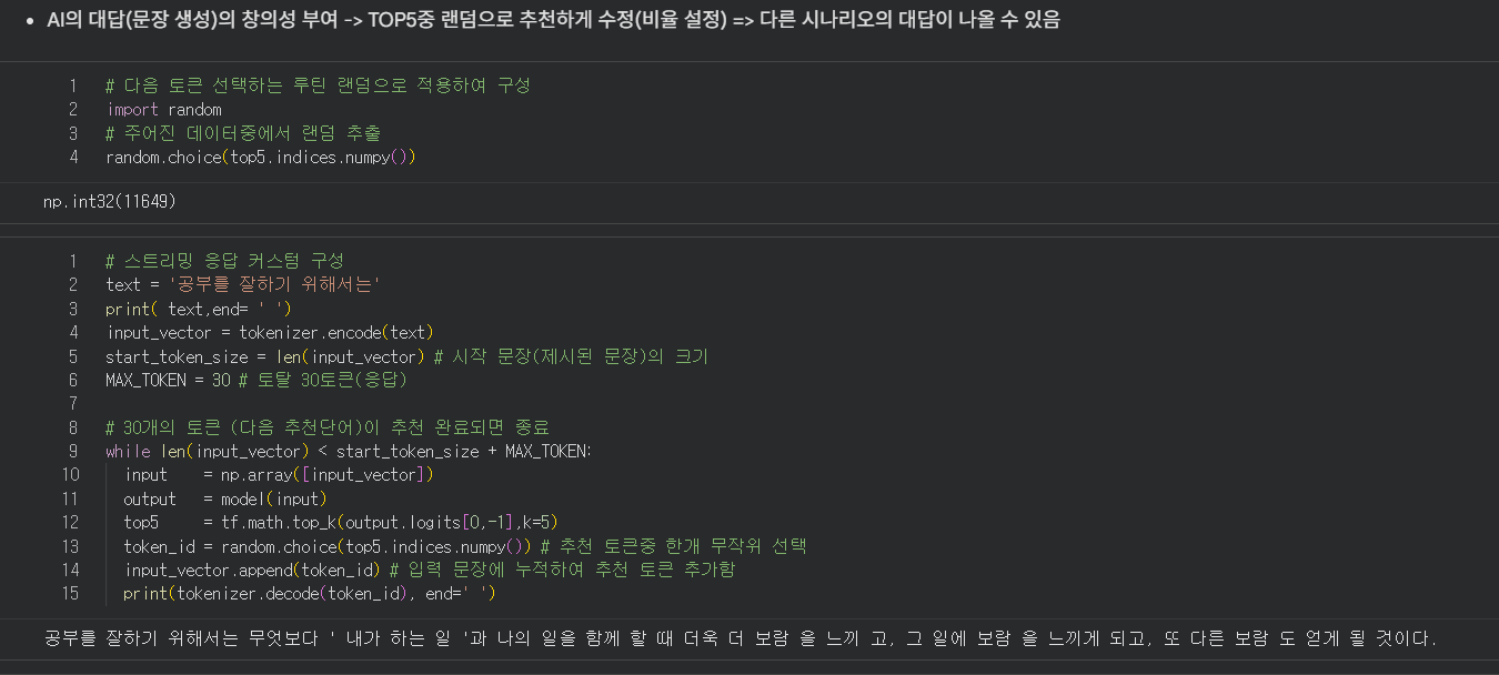 - 단어(토큰) => 다음 단어(토큰) 추천(TOP5등 설정 가능함(랜덤 선택)-> 의외성 부여 -> 창작성을 높임, 최적)