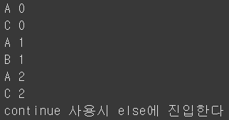 for에서 순서대로 0, 1, 2가 내려온다. 이 때 for 문에는 'A' 출력과 'C'출력이 걸려있는것이다. 이 때 0 == 1 은 False이므로 'B'는 출력되지 않는다. 그 이후 1 == 1 이므로 B가 출력된 이후 continue를 통해서 다시 for 문으로 돌아간다. 그리고 2 == 1 False 이므로 다시 A 와 C 만 출력된다. 마지막으로 반복문이 문제없이 돌아갔기 때문에 else절이 출력되는것이다.
