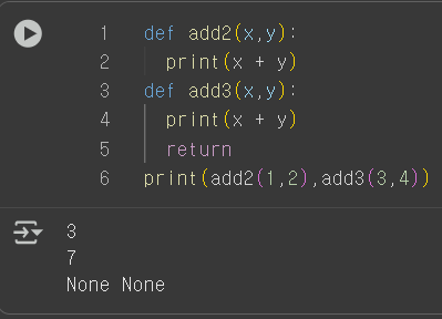 def add2( x, y ) : print ( x + y) add2 ( 1 , 2 ) 3 결과값은 나온다, 하지만 이는 함수로 반환한 것이 아닌 그저 x y 에 정수값을 대입한 것이기 때문에 함수 호출의 결과는 None로 나온다.