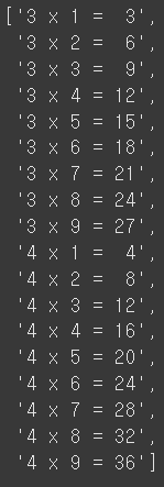 temps = [ f'{n} x {m} = {n * m:>2}' for n in range (3, 5) for m in range (1,10) ] temps 출력값은 리스트에 3단과 4단이 담긴 형태로 출력된다. 순서만 변경된 것 같지만 데이터가 바로 리스트에 담겨서 출력된다는 점에서 데이터 처리 속도면으로 아주 유용한 기술이라고 한다.