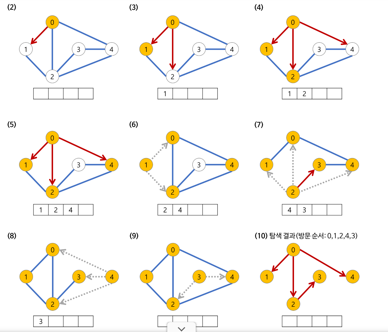 인접한 노드가 없다면 큐의 앞에서 노드를 꺼낸다(dequeue).
