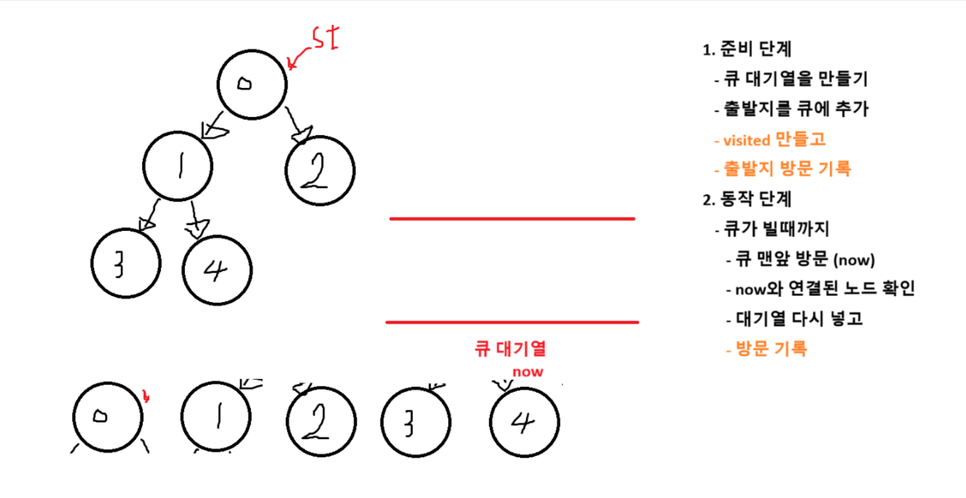 큐에서 커낸 노드과 인접한 노드들을 모두 방문한다.